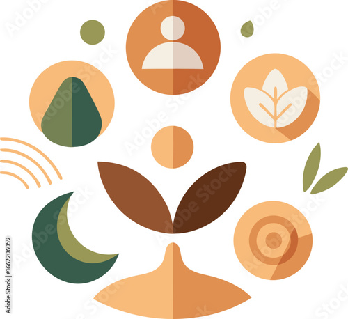 nature, wellness, illustration, emblem, circular, logotype, design, tree, plant, leaf, landscape, hill, moon, star, night, woman, profile, face, calm, serene, organic, botanical, minimalist, line art, outline, symbol, icon, beauty, health, growth, harmony
