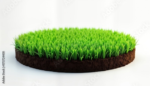 Circular section of rich green grass atop dark brown soil. Freshly grown grass sits on top of soil. Ideal for eco themes. Natural landscape isolated against white background. Perfect for nature,