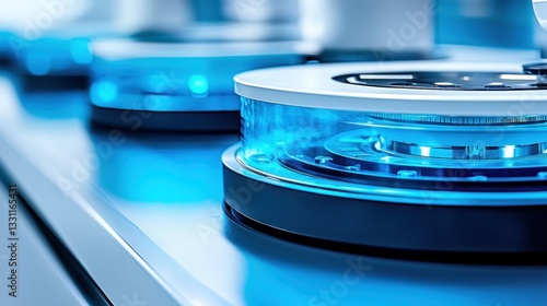 Circular tech equipment shines blue with metallic, glossy surfaces and depth