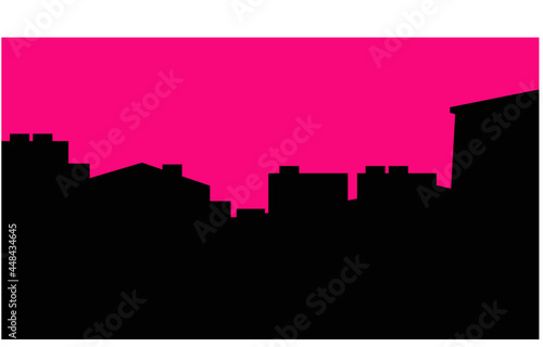 City. Black silhouette of houses on a background of pink sky. Vector image for prints, poster and illustrations.