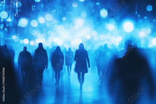 crowd, people, silhouette, blue, surreal, night, light, city, abstract, fog, shadow, motion, mystery, urban, walking, group, human, moody, glowing, haze, figure, bokeh, concept, night scene