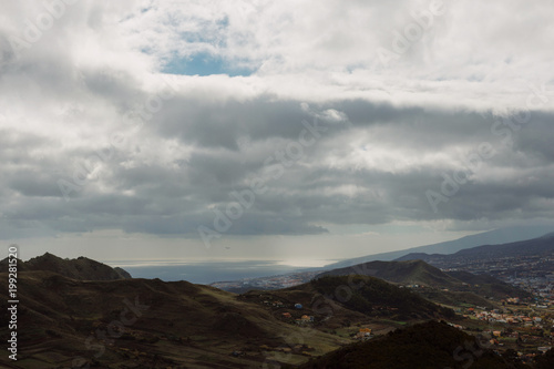 City in mountains with deep rainy clouds. Tenerife. Top view