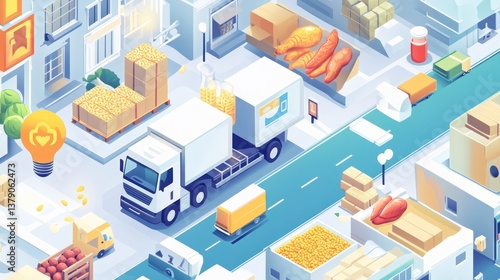 City logistics, delivery trucks, goods transport, isometric illustration, urban scene