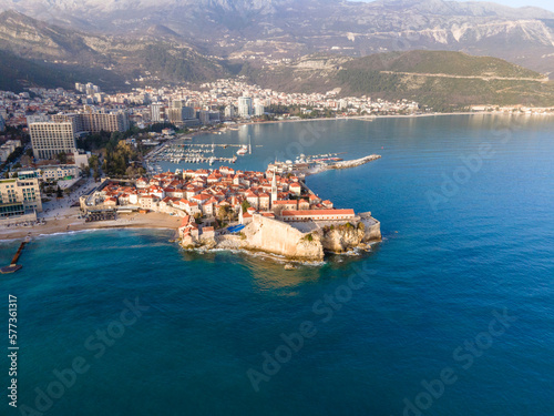City of Budva, Montenegro. Drone view of the old city. Sunny day.