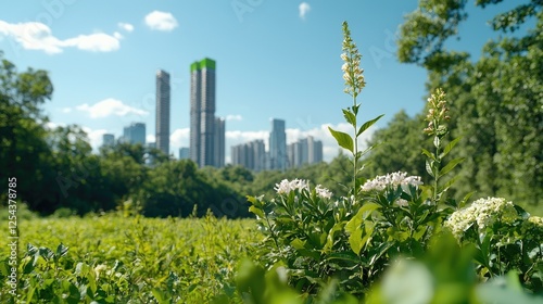 park, flower, summer, skyscraper, city, background, nature, green, plant, white, urban, landscape, bloom, blossom, sunlight, tree, leaf, sky, day, spring, beauty, environment, scene, view, photo, image, picture, photo, city landscape, city park, summer flowers, city view