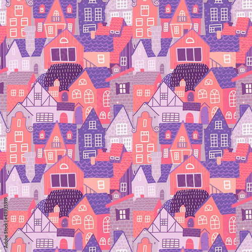 City seamless colorful pattern with hand drawn old european houses at spring. Pink Repeating background with the old town. For wallpapers,textile and scrapbooking. Vector flat illustration.