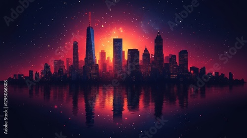 city, skyline, night, water, sunset, urban, building, downtown, metropolis, architecture, city landscape, skyscraper, light, dark, star, river, lake, dusk, evening, modern, landscape, horizon, twilight, illuminated, vibrant, glow, colourful, scenic, dramatic, peaceful, tranquil, fantasy, abstract, digital, art, wallpaper, background, design, graphic, illustration, city landscape, city lights