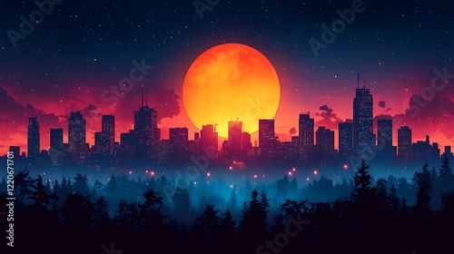 city, skyline, night, moon, orange, large, giant, building, skyscraper, urban, forest, tree, dark, red, pink, purple, blue, star, sky, cloud, silhouette, landscape, artwork, digital, art, illustration, graphic, design, vibrant, colours, contrast, light, shadow, atmosphere, mystical, magical, scene, view, majestic, beauty, nature, environment, calmness, serenity, evening, dusk, twilight