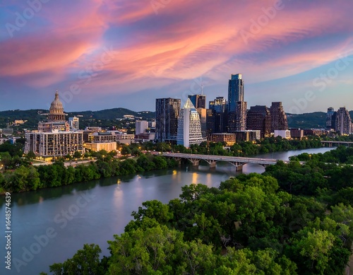 city, skyline, sunset, river, building, tree, cloud, pink, orange, light, colours, evening, landscape, panorama, view, urban, beautiful, nature, bridge, hill, green, water, modern, architecture, calm, tranquil, summer, dusk, elevated