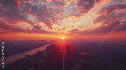 city, skyline, sunset, sun, cloud, sky, red, orange, pink, glow, light, urban, building, city landscape, skyscraper, horizon, evening, dusk, twilight, gold, hazy, view, aerial, architecture, downtown, modern, river, water, haze, shadow, atmosphere, nature, beauty, panorama, perspective, high, up high, contrast, abstract, dramatic, colours, art, photo, landscape