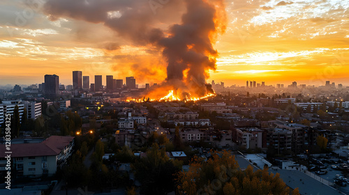 city landscape, fire, smoke, sunset, burning, sky, orange, disaster, destruction, urban, building, emergency, dramatic, heat, alarming, flames, daylight, danger, aftermath, apocalyptic, aerial view, cloud, rooftop, tree, residential, silhouette, horizon, illumination, warm, vibrant, environment, risk, catastrophy, blaze, spreading, incident, damage, conflagration, wildfire, glowing, inferno, devastation, combustion, ember, twilight, burn