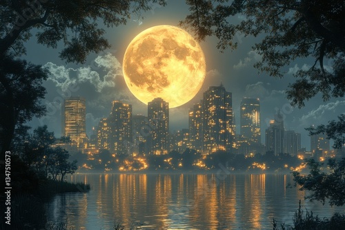 City skyline illuminated by a large full moon at night reflecting on a calm water body