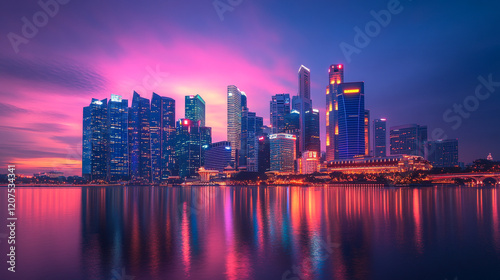city skyline, skyscraper, sunset, colorful sky, reflections, urban, architecture, water, evening, light, building, waterfront, metropolis, travel, serene, modern, landscape, downtown, city landscape, panoramic view, scenic, dusk, illumination, tranquil, tour tourism, vibrant, peaceful
