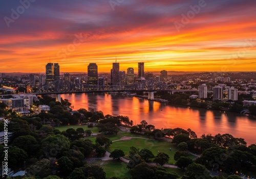 sunset, city landscape, river, skyline, building, orange, purple, city, tree, urban, architecture, water, bridge, dusk, evening, park, light, horizon, glow, landscape, scenic, tour tourism, travel, aerial, view, modern, metropolis, skyscraper, twilight