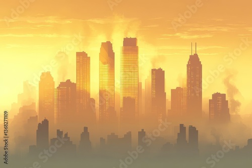 city, skyline, fog, morning, skyscraper, mist, sunrise, gold, light, urban, mysterious, high, rise, silhouette, awakening, transition, calm, pop, culture, vibrant, colours, massa, production, consumerism, iconic, imagery, art, illustration, print, landscape, background, desktop, wallpaper