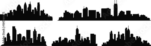 City skyline silhouette collection, urban building outlines, skyscraper cityscape shapes, modern architecture vector design, metropolitan horizon view, black urban landscape illustration