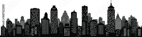 City skyline silhouette, urban cityscape, tall buildings with lights, metropolitan skyline view, modern architecture, skyscrapers at night, city horizon, downtown cityscape, urban