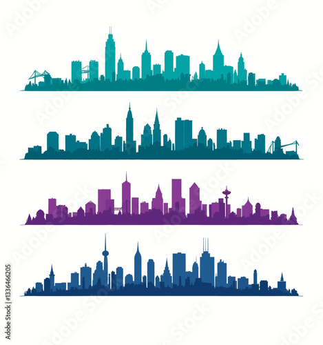 City Skyline Silhouettes in Teal, Purple and Blue