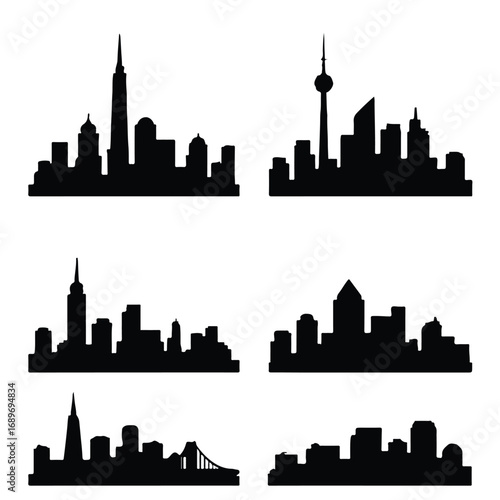 City Skyline Silhouettes Vector Set – Urban Buildings, Towers, Skyscrapers, and Landmarks