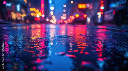 City street at night, wet asphalt, colorful reflections