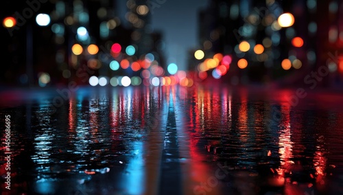 City street at night, wet asphalt reflecting vibrant lights. Urban scene with blurry buildings and street lights