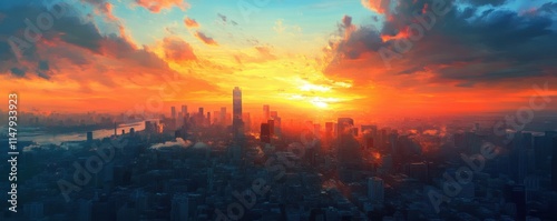 City Sunset: Beautiful sunset over a city skyline, orange and blue hues, tall buildings and cityscape, aerial view, urban charm