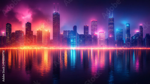 cityscape at night, featuring glowing neon lights, towering skyscrapers, and futuristic architecture. The scene captures an urban landscape with a dynamic, tech-inspired atmosphere