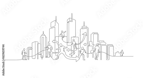 Cityscape of Progress: A Continuous Line Depicts a Modern Cityscape, Where Figures Represent Progress, Innovation, and the Dynamic Exchange of Ideas, All Embracing the Essence of Growth and Evolution.