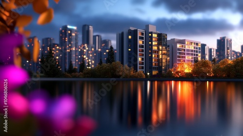 city, building, skyline, dusk, sunset, lake, water, urban, night, city landscape, modern, architecture, skyscraper, apartment, tower block, window, light, glow, illumination, evening, twilight, sky, cloud, calm, serene, tranquil, peaceful, residential, development, real estate, property, living, home, downtown, metropolis, city life, city lights, nightlife