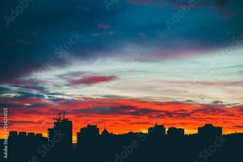 Cityscape with wonderful varicolored vivid dawn. Amazing dramatic multicolored cloudy sky above dark silhouettes of city buildings. Atmospheric background of sunrise in overcast weather. Copy space.