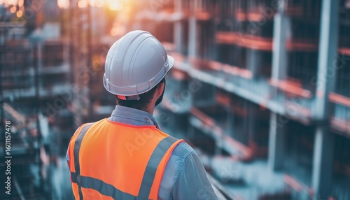 Civil Engineer In Safety Uniform Supervising Construction Site, Worker Monitoring Project, Architectural Engineering On New Building Project.
