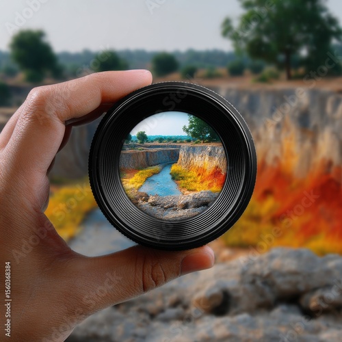 quarry, countryside, landscape, hand, lens, rock, earth, excavation, nature, dust, depth, texture, perspective, framing, clarity, viewfinder, contrast, composition, terrain, gravel, scene, manual, shot, exposure, geology, stone, mineral, fisheye, sharpness, horizon, outdoors, frame, environment, foreground, background, tool, realism, natural, looking, glasses