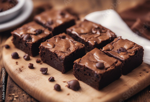 classic american brownies with a fudgy center, served on a wooden board
