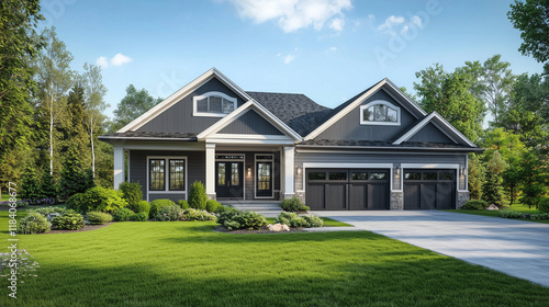 Classic American house exterior with double garage, lush lawn, and neat landscaping.