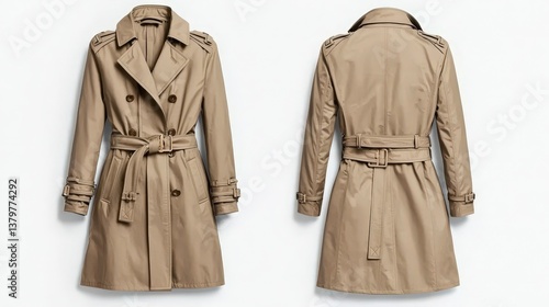 Classic beige double-breasted trench coat with belted waist and adjustable cuffs
