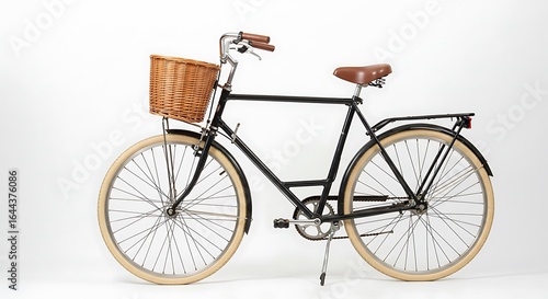 bicycle, bike, basket, wicker, transportation, cycling, vintage, retro, classic, black, white, wheel, tire, seat, handlebar, frame, pedal, transport, urban, city, lifestyle, recreation, leisure, exercise, healthy, environmentally friendly, vehicle, outdoors, design, style, object, equipment, journey, travel, commute, cycle, road bike, minimalist, simple