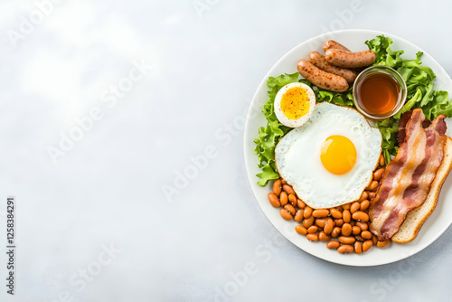 Classic breakfast plate with egg, bacon, beans and sausages. Food photography