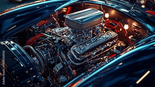 classic car, engine, craftsmanship, chrome, automotive, event, night time, mechanic, detail, vintage car, performance, horsepower, restoration, illumination, shiny, hot rod, car show, exhibition, racing, tuning, engineering, collectable, vehicle, machinery, motor