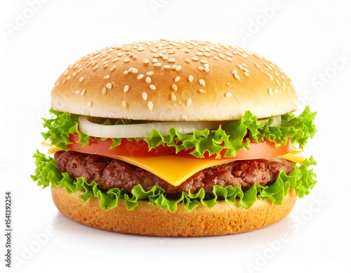 cheeseburger, hamburger, burger, fast food, cheese, lettuce, tomatoes, bun, sesame seeds, delicious, savoury, meal, lunch, dinner, take-away, junk food, grilled, cooked, white background, isolated, studio shot, food photography, classic, tasty, greasy, hearty, dinner, snack, eatery, cafes, comfort food, traditional, meat, dairy, vegetable