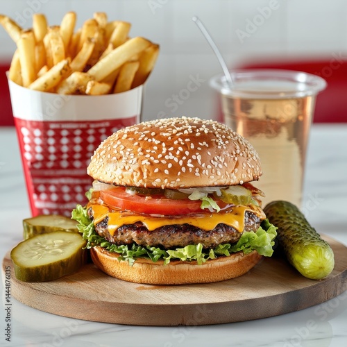 Classic Cheeseburger with Fries and Drink on Wooden Board cheeseburger burger hamburger fries drink