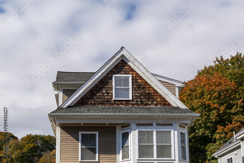house, traditional, style, attic, siding, exterior, facades, scallop, end, decorative, bay, window, old, wooden, triangular, fascia, gable, roof, pitched, america, american, architecture, dwelling, property, urban, residence, view, structure, residential, vintage, building, shape, grey, shingle, brown, frame, trim, white, background, tree, cloudy sky, outside, boston, new england, us, suburb