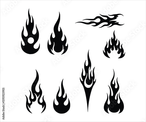 Classic flame silhouette. A black fire design set against a white background. tattoo features a neo-tribal style or flame silhouette perfect for cars. It's a minimalistic and stylish outline of fire,