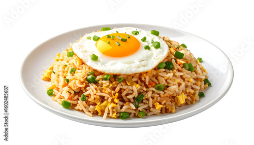 Classic fried rice topped with a sunny-side-up egg and green onions.