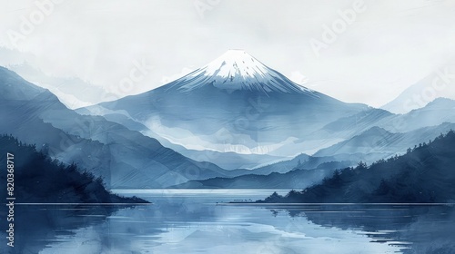 Classic Japanese View in Sumi Ink Painting. Mount Fuji in sumi ink.