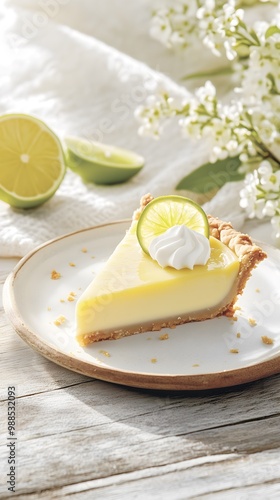 Classic Key Lime Pie Natural Setting Rustic Wooden Surface Blooming Flowers