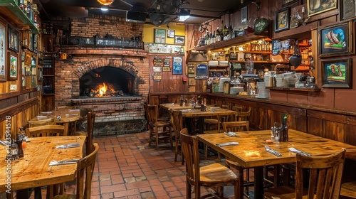 Classic rustic sausage and bread shop with a brick oven, wooden tables, and golden light giving the space an inviting, cozy atmosphere.