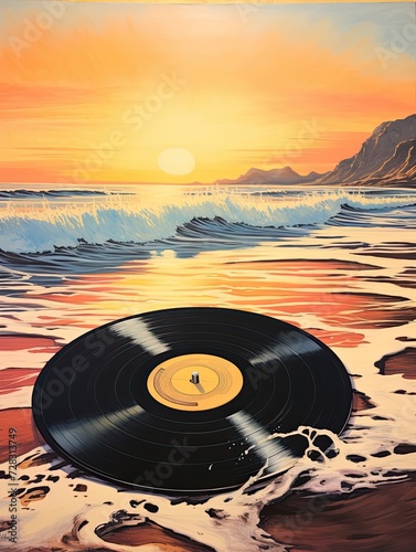 Classic Vinyl Record Art: Beach Scene Painting with Tunes on Sandy Shores