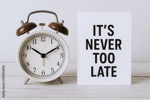 Classic white alarm clock with brown bells displaying time and motivational quote card.