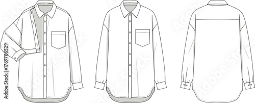 Classic white button up shirt with long sleeves, front pocket, back yoke, fashion flat sketch design