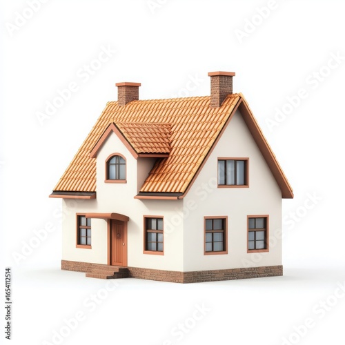 Classic White Two Story House with Orange Tiled Roof and Brick Chimneys on a White Background in a Geometric and Rendering Style